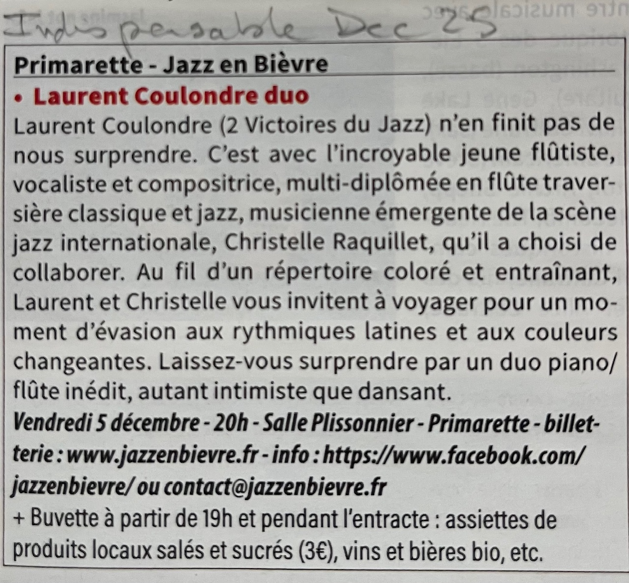 – Annonce Laurent Coulondre. L’indispensable Déc 2025.